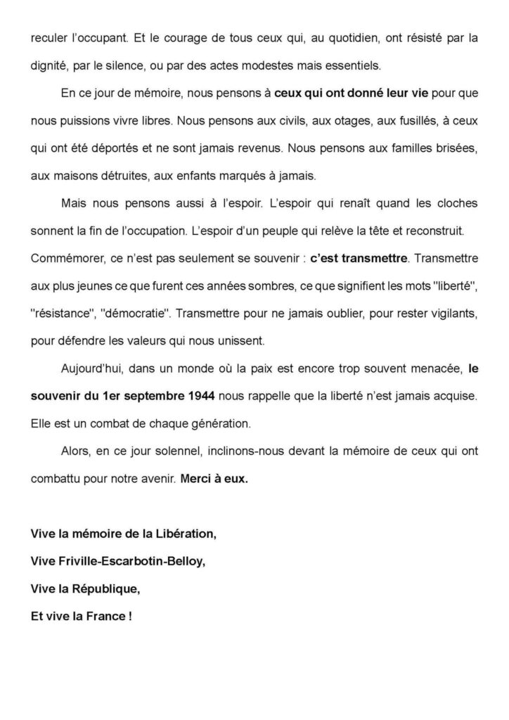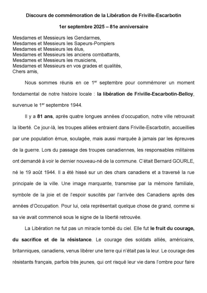 Commémoration de la libération de Friville-Escarbotin-Belloy 1 Sep,2025 admin5055Laisser un commentaire Ce lundi 1er septembre, comme à chaque commémoration, nous étions présents à la cérémonie célébrant le 81è anniversaire de la libération de la commune. Voici le discours que j’ai prononcé au monument aux morts :